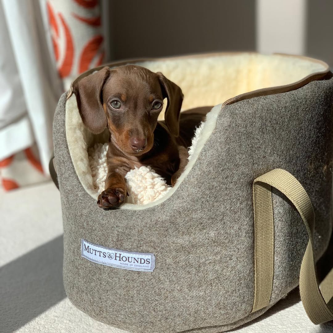 Made from premium Yorkshire tweed with a cosy fleece interior, our Grey Tweed Dog Carrier is perfect for safely introducing your puppy to the world or for lazy days out and about. Available in two sizes, you can find the measurements on the product page.
